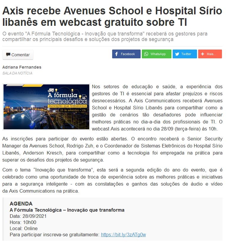 Axis recebe Avenues School e Hospital Sírio libanês em webcast gratuito sobre TI